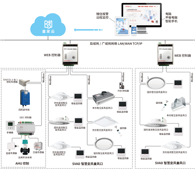 SVAD智慧變風(fēng)量空調(diào)系統(tǒng)延續(xù)VAV變風(fēng)量空調(diào)系統(tǒng)的就地控和聯(lián)網(wǎng)控功能,又開(kāi)發(fā)出云端遠(yuǎn)程控制,售后工程師可異地遠(yuǎn)程參與系統(tǒng)的維護(hù)和管理,提供遠(yuǎn)程技術(shù)服務(wù)支持。