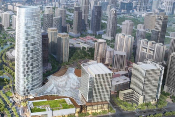 整個(gè)項(xiàng)目由一棟250米的地標(biāo)超甲級(jí)辦公、兩棟100米左右的甲級(jí)辦公以及裙房商業(yè)組成,五個(gè)獨(dú)立的裙房在東臺(tái)路合圍成了一個(gè)五邊形空間,頂部由一個(gè)大型天幕覆蓋;